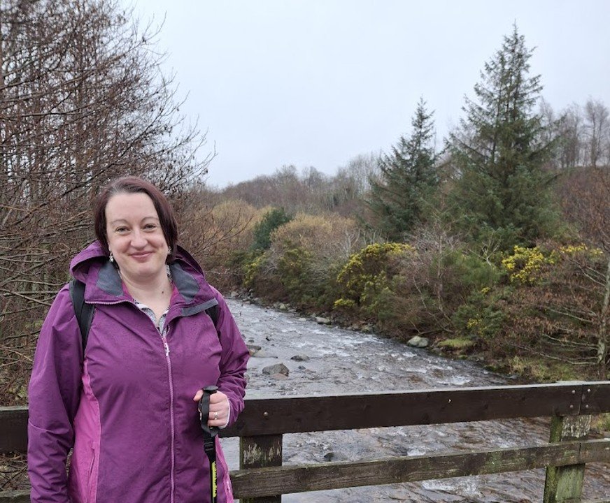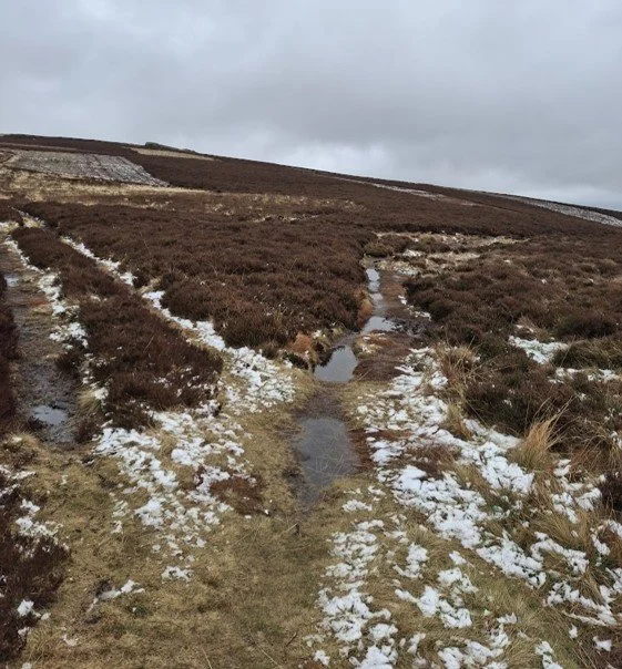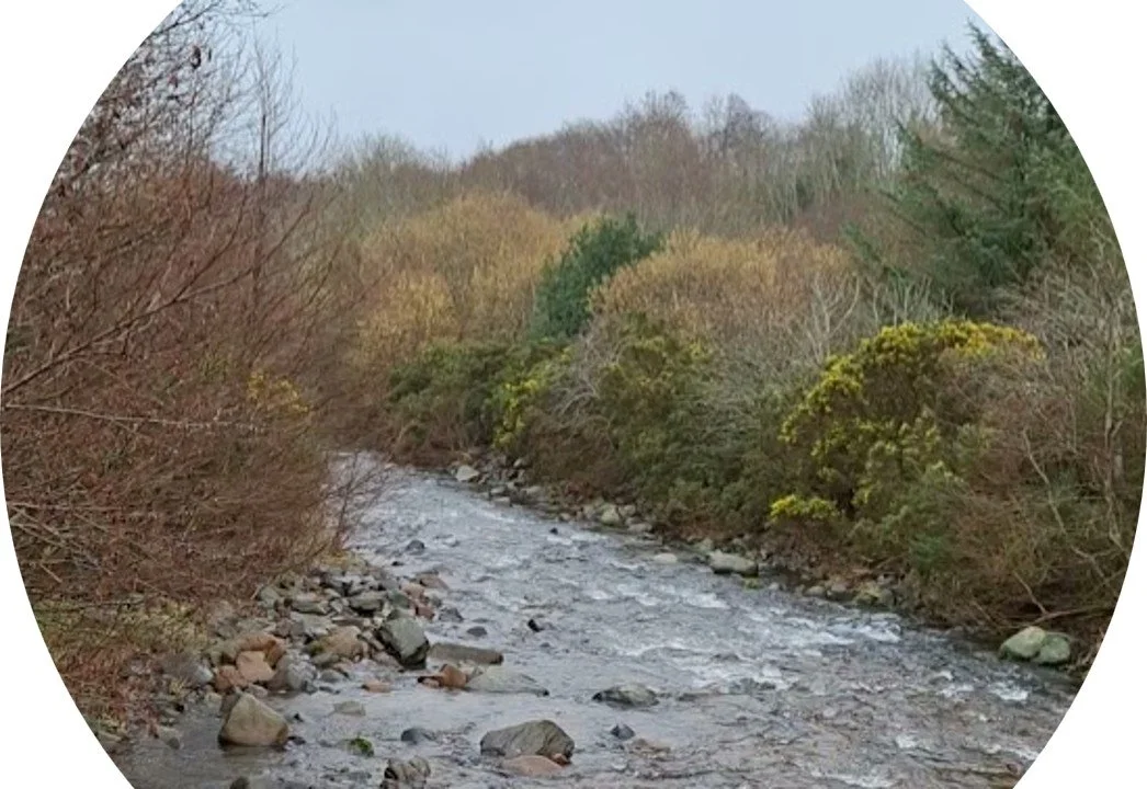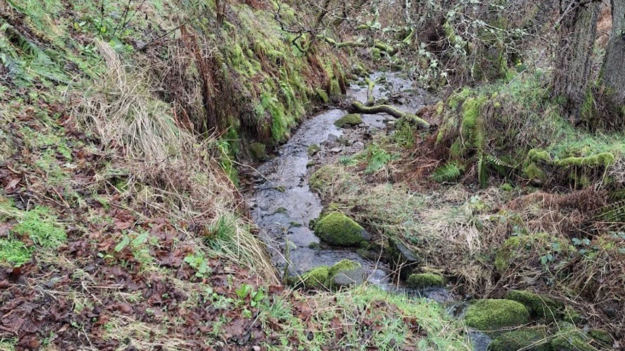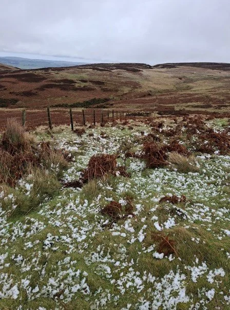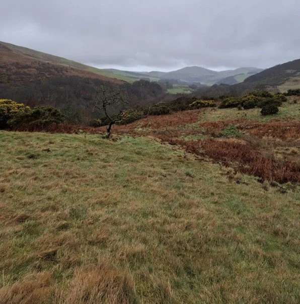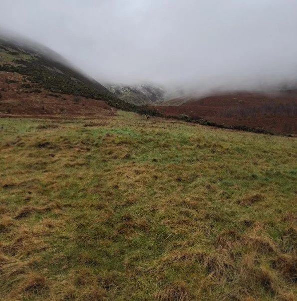After a night of heavy rain, the College Burn ran fast this morning. We passed over several more streams in this damp and misty valley.